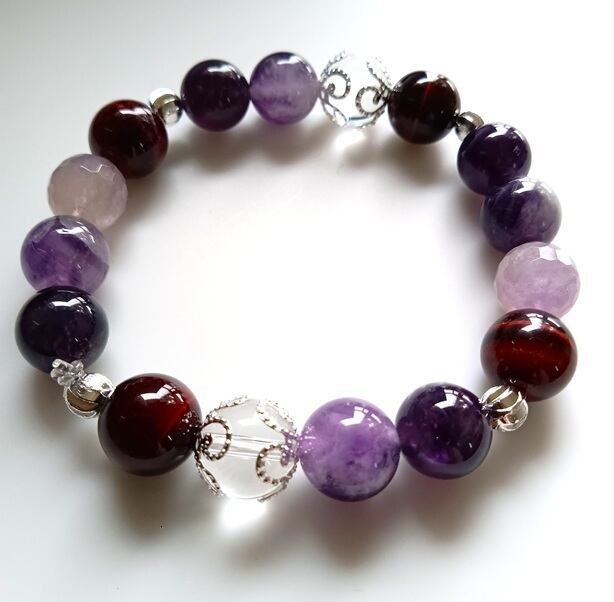 アメジストは心と魂の浄化効果があり、ストレスや不安をやわらげるとされています。タイガーアイは自己主張を強め、自信と勇気を与えてくれます。。水晶は浄化や活性化の力を持ち、身体や心を整える助けとなります。自然のエネルギーを感じながら、ブレスレットとして着用することで、日常生活の中でエネルギーチャージができます。ストレスや疲れが溜まった時に、このブレスレットを身に付けることで、心をリラックスさせることができます。自分自身へのご褒美や、大切な方へのプレゼントにもオススメです。日常のアクセサリーとしてはもちろん、寝る前につけることで、あなたに穏やかな眠りと癒しをもたらすことでしょう。より効果を実感することができます。