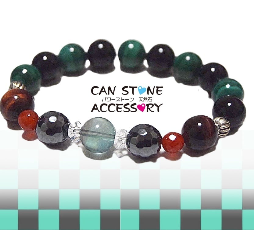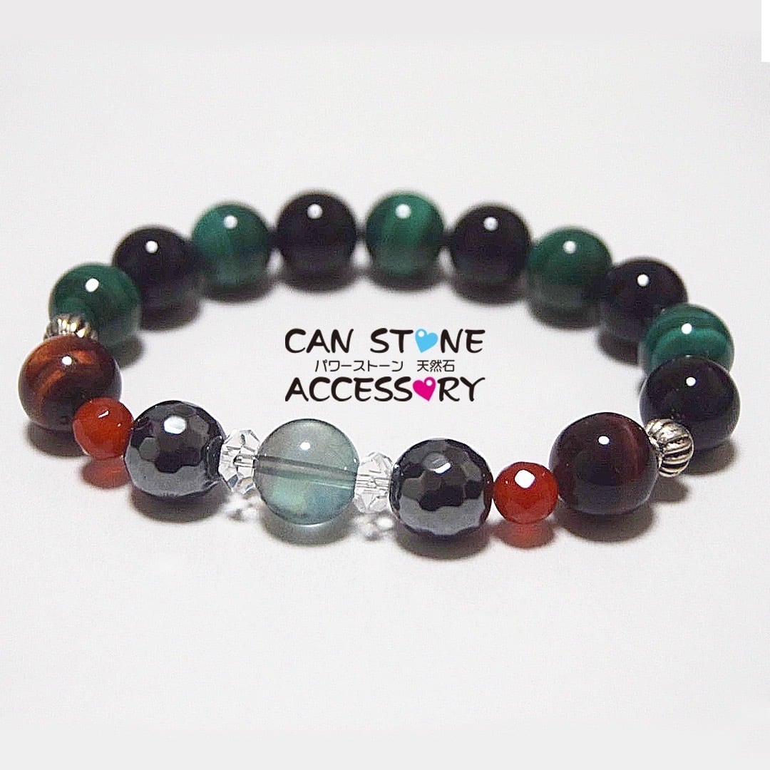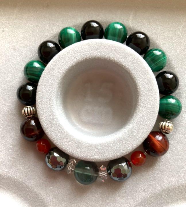 マラカイト、オニキス、ヘマタイトの3種類のパワーストーンを使用したブレスレット。それぞれの天然石がもつパワーを活かし、心身のバランスを整えます。