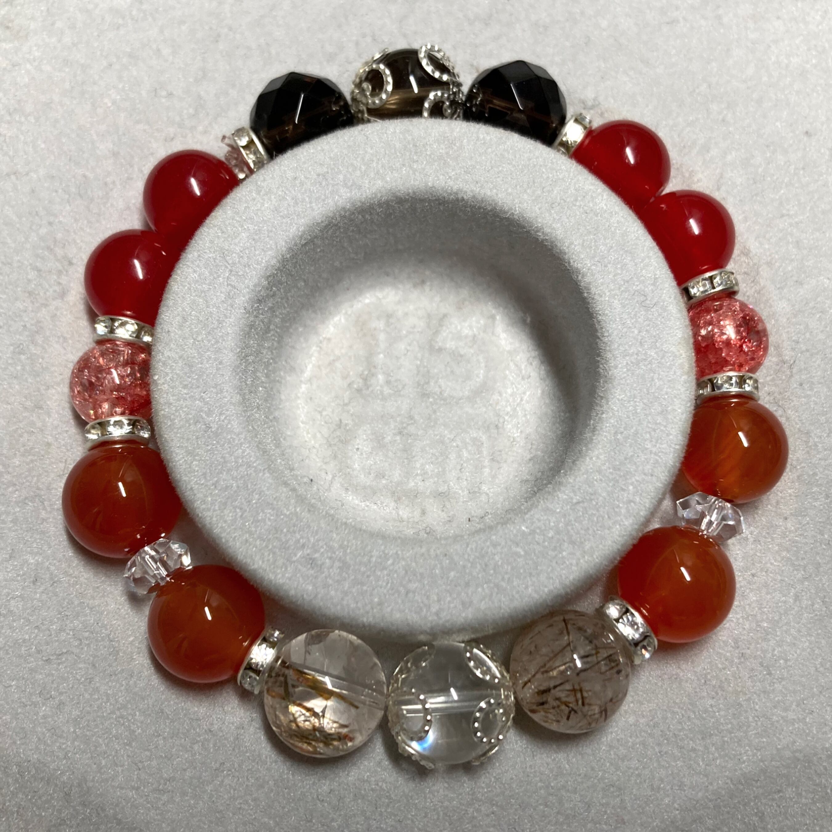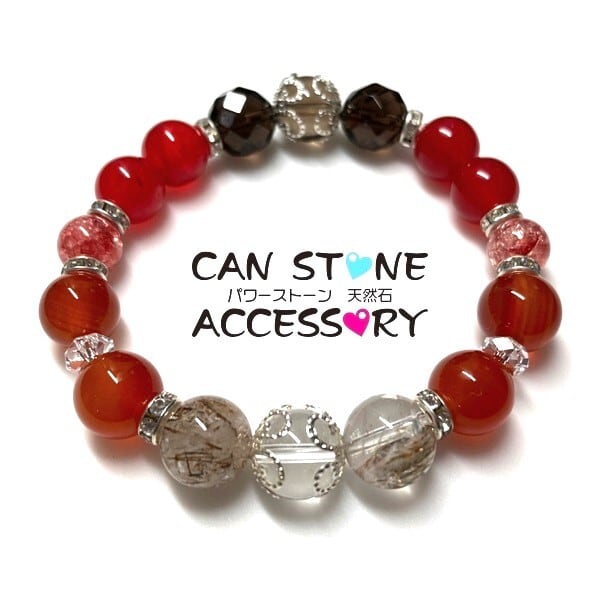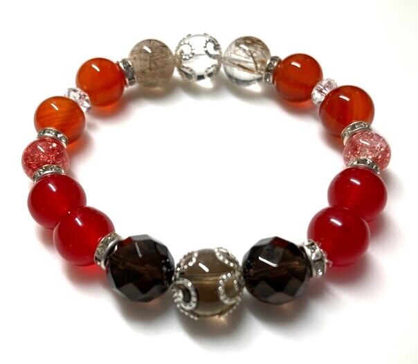 スーパーセブンは強力なパワーを秘めた石であり、持ち主の内面のバランスを整えると言われています。カーネリアは勇気と自己表現の象徴で、積極性と自己信頼心を高めてくれるでしょう。スモーキークォーツは心を癒し、自己肯定感を高める作用があります。レッドジェイドは情熱とエネルギーを与え、自己表現を促します。自分自身への気遣いや愛情を高め、日々の生活にポジティブなエネルギーをもたらすことができます。特別な機会や普段使いに合わせて、自分自身へのご褒美としてお楽しみください。